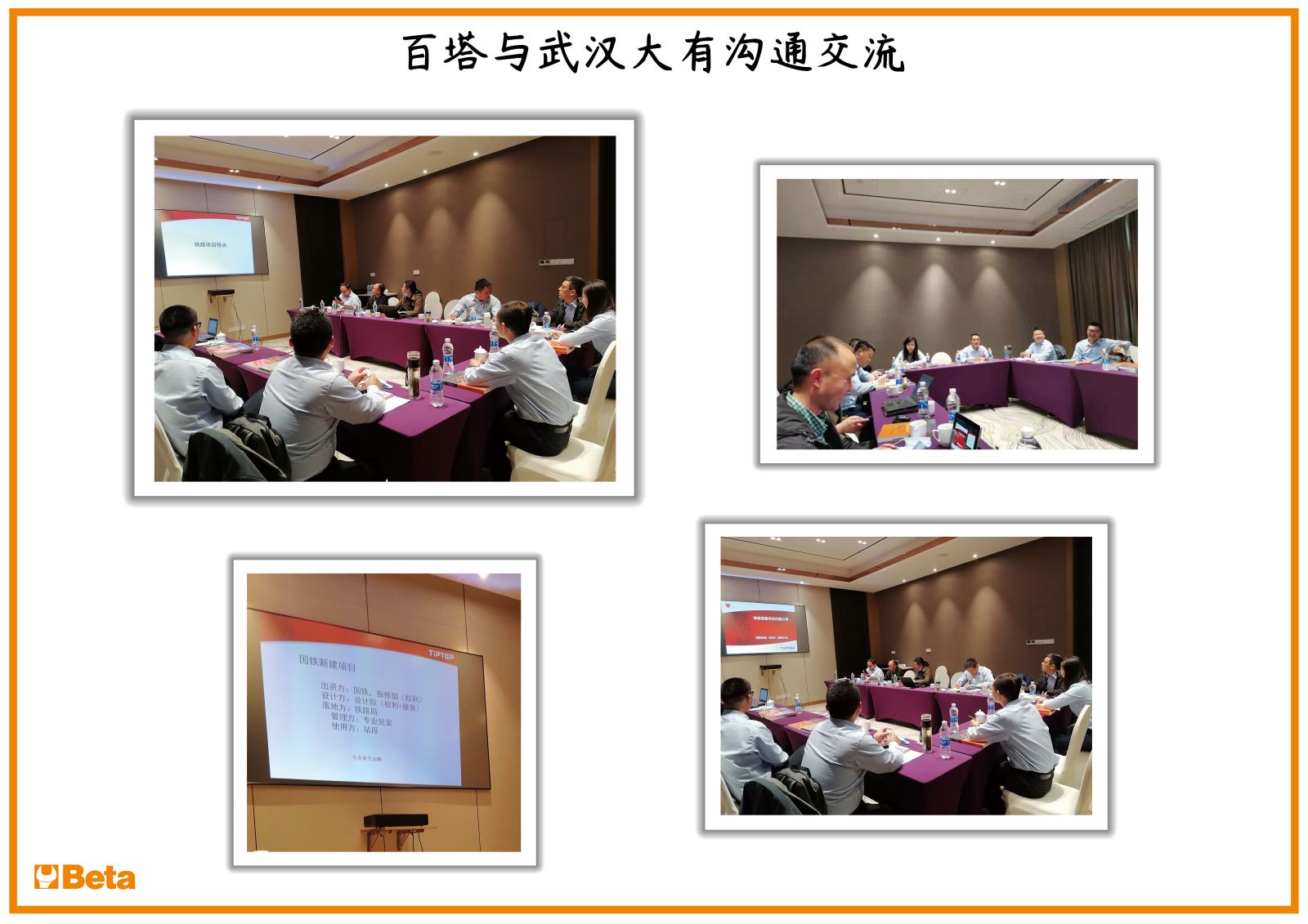 会议回顾了公司在今年第一季度的业绩表现,再次确定了公司上半年度的销售计划和目标,并就近阶段市场、客户以及销售工作中出现的具体问题进行了分析和讨论。会议期间,百塔中国团队还和武汉大有机电系统有限公司管理团队就如何加强双方在国铁商城的合作进行了专门讨论。