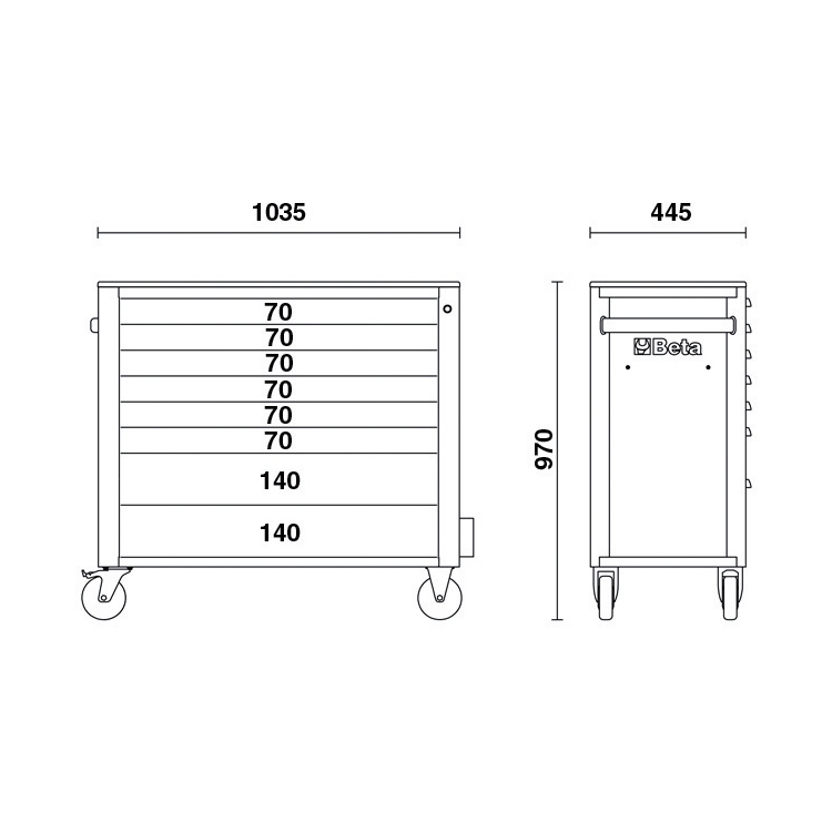 • 四个Ø 125 mm脚轮:2个固定和 2个转向(1个带刹车)